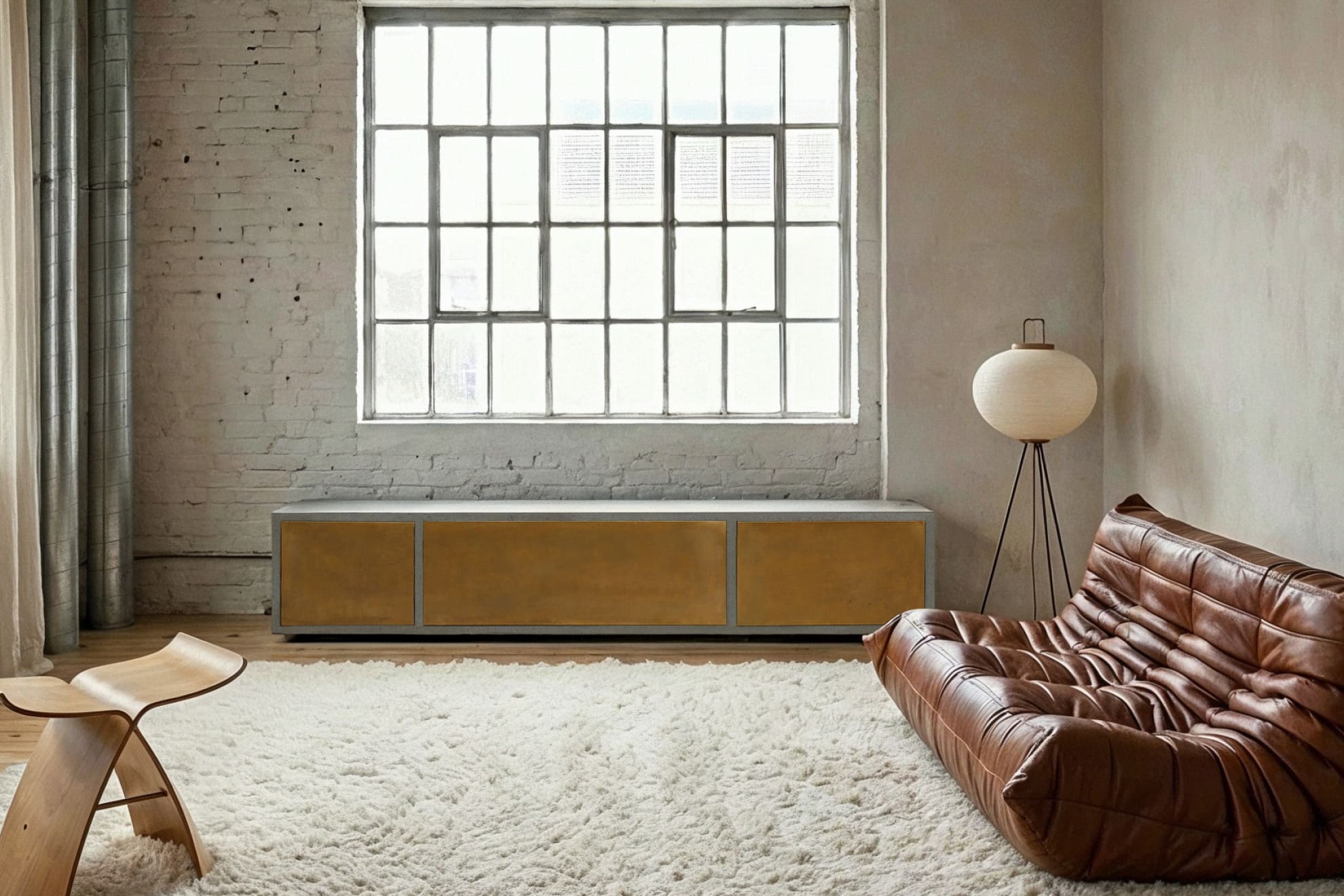 Wie ein Fels in der Brandung. So steht das Lowboard oder Mediaboard »Urban Box« für extreme Resonanzärme und Steifheit. Das macht die Urban Box zum perfekten Möbel für Hifi-Komponenten höchster Qualität. Selbst das Zuwerfen der Schubladen lässt die Plattenspielernadel sanft und ohne jedes Springen über das Vinyl laufen. Somit genügt sie höchsten Ansprüchen an Klangfarbe und Brillanz. Aber auch Spielekonsolen und Zubehör finden spielerisch Platz. Die Urban Box Brass gibt es in fünf Breiten von 160 bis 270 cm mit Schubladen oder Klappen. Das Finish der Messing-Fronten kann »poliert« oder »patiniert« gewählt werden. Nach Ihrer Bestellung nehmen wir Kontakt bzgl. der Ausstattung mit Ihnen auf.Aktuell gibt es nur Fotos des 270er Models in Betongrau mit patinierten Fronten und Sonderausstattung (vertikale Fächer). Ein Foto mit lackierter Front finden Sie unten.
