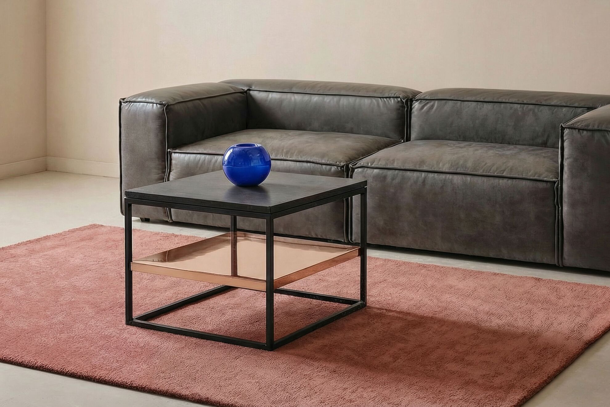Klassischer Beistelltisch mit Betonplatte (50 x 50 cm) in Leichtbauweise für einfaches Handling. Zusätzlich ausgestattet mit einem Ablagefach in Kupfer.
