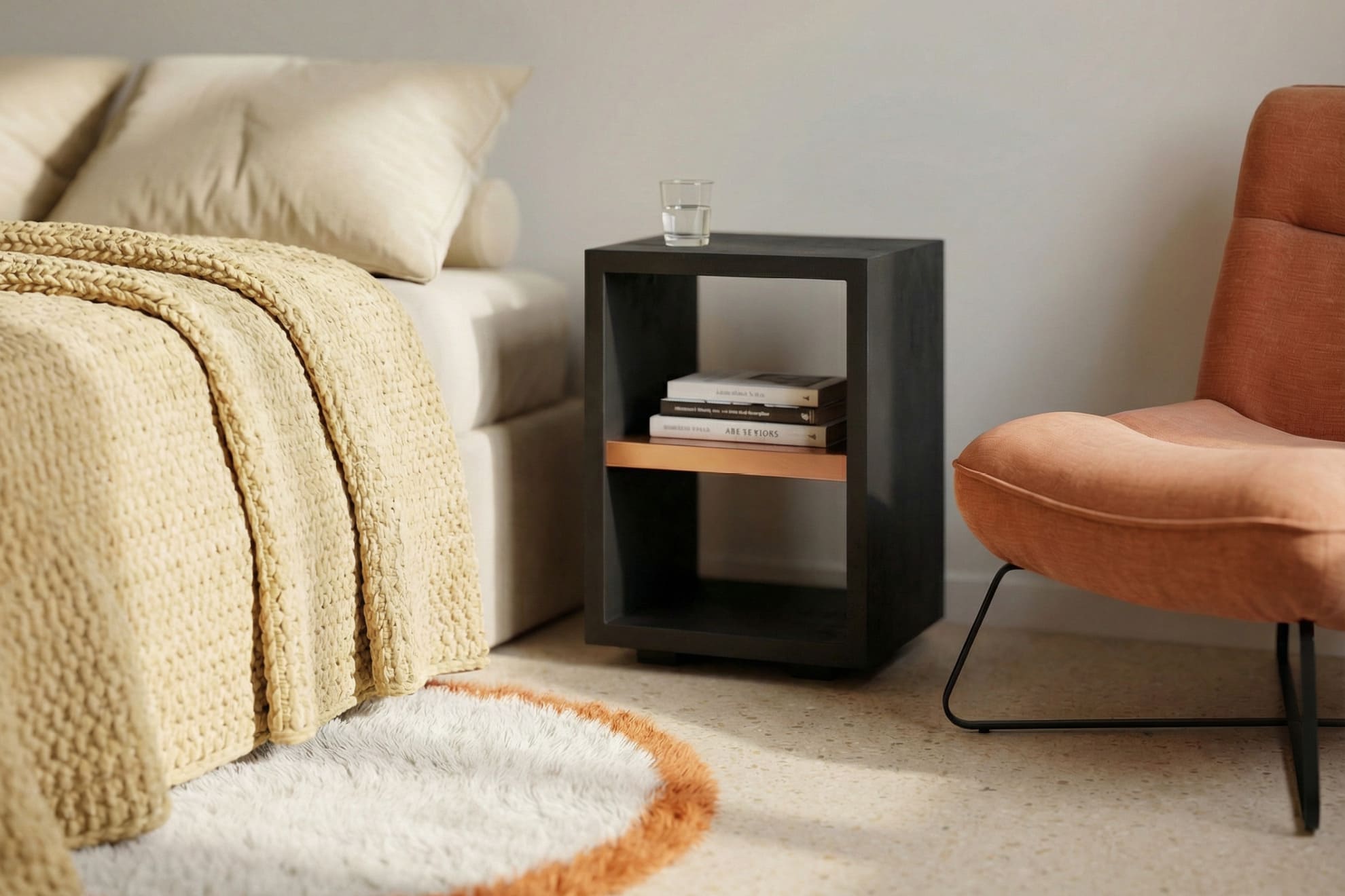 Der minimalistische Nachttisch »Goodnight« mit seiner Ablagefläche in Kupfer kommt in jedem Schlafzimmer gut an und braucht nicht vieler Worte. Auf einen kleinen Sockel gestellt dient er dem Buch, dem Smartphone oder der Nachttischlampe zur Ablage. BxHxT: 40 x 50 x 40 cm, Höhe zzgl. 3 cm Sockel